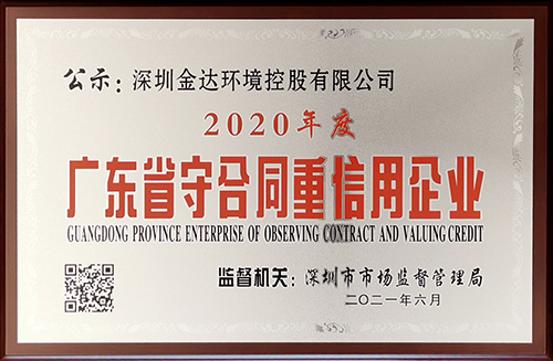 近期,深圳市市場監督管理局公示了2020年度廣東省守合同重信用企業審核結果,深圳金達環境控股有限公司憑借規范治理和誠信經營榮獲廣東省守合同重信用企業稱號。